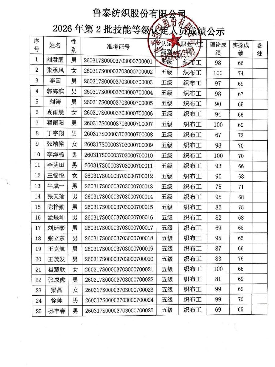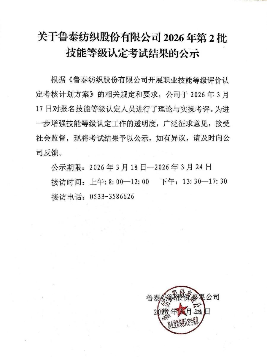 关于鲁泰纺织股份有限公司 2026 年第2批技能等级认定考试结果的公示